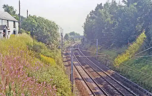 Trains pass at speed on the electrified West Coast Main Line but there is no station at the site now.