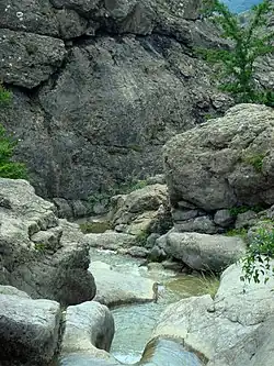 In 1915 Alexander Kruber first described the karst of the mountains.[1] The Crimean Mountain karst was declared a nature reserve in 1989. Comprising central Qarabiy yayla, the Crimean Mountain karst includes more than 4,000 sinkholes and 209 caves, among them the Soldier cave, the deepest in Crimea. Additionally, the top of the karst is home to beech and pine forests, as well as meadows and areas dominated by Cerastium biebersteinii.[2] The area has more than 1000 natural karst cavities. Minerals found in the cavities include: calcite, gypsum, goethite, aragonite, illite, quartz, kaolinite and pyrolusite.[3]