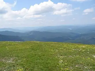 The reserve lies on the main ridge of the Crimean Mountains along the southern edge of the Crimean Peninsula. The highest mountain in Crimea is in the reserve - Roman-Kosh at 1,545 metres (5,069 ft).[1] The northern slopes of the mountains are long and gentle, the southern slopes drop steeply towards the sea. The higher ridges are frequently flat, grassy plateaus. The geology of the mountains is mixture of shales, sandstones, limestones and conglomerates, from different times in the Jurassic. The variety of rocks have eroded to form a diversity of soils at the lower elevations, supporting mountain-steppe and meadow-steppe.[1] The headwaters of the Alma River are in the reserve.