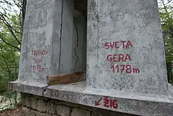 The summit is claimed by both Croatia and Slovenia[39][40] and is recorded in the Croatian land registry. An old Yugoslav People's Army barracks building stands there that is used as an outpost by the Slovenian Army.[41][42] Control over the military complex is another part of the dispute. Diplomacy has kept this dispute from escalating.