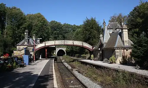 Known originally as Cromford Bridge, it was opened by the Manchester, Buxton, Matlock and Midland Junction Railway in 1849.[3] This is one of the few stations on the line that has been preserved and is a Grade II listed building. It is said to have been designed by G. H. Stokes, son-in-law of Joseph Paxton. It is believed that Stokes designed Station House (built in 1855), the extremely ornate former station master's residence opposite the station on the side of the hill as well as the ornate villa style waiting room, on what was the up platform. According to English Heritage,[4] this is the original station building; the present building on the opposite (down) platform was added by the Midland Railway at a later date.