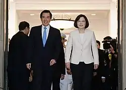 Chen Shui-bian of the pro-independence Democratic Progressive Party (DPP) was elected President of the ROC in 2000. Before the KMT handed over power to the DPP, chairman of the Mainland Affairs Council Su Chi suggested a new term 1992 Consensus as a common point that was acceptable to both sides so that Taiwan and China could keep up cross-strait exchanges.[61] Chen expressed some willingness to accept the 1992 Consensus, but backed down after backlash within his own party.[62] In his inaugural speech, Chen Shui-bian pledged to the Four Noes and One Without, in particular, promising to seek neither independence nor unification as well as rejecting the concept of special state-to-state relations expressed by his predecessor, Lee Teng-hui, as well as establishing the Mini-three Links. Furthermore, he pursued a policy of normalizing economic relations with the PRC.[63] The PRC did not engage Chen's administration, but meanwhile in 2001 Chen lifted the 50-year ban on direct trade and investment with the PRC.[64][65] In November 2001, Chen repudiated "One China" and called for talks without preconditions.[66] On 3 August 2002, Chen defined the cross-strait relations as One Country on Each Side (namely, that China and Taiwan are two different countries). The PRC subsequently cut off official contact with the ROC government.[67]