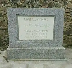 A stone plaque inscribed with the characters 「古剎十字禪林」 ('Ancient Cross Buddhist Temple')[63] had previously been installed atop the temple's gate.[64] Records from 1919 indicated the plaque was still present, but in 1931 Saeki noted that it had fallen off and broken.[63][65] When Wu Mengling (吴梦麟) visited the site in October 1992, he found one of the broken pieces in front of the gingko trees.[65] According to Wang, the plaque is currently stored by the Fangshan District Bureau of Cultural Artifacts,[65] though Tang and Zhang claimed it is on display at the Beijing Stone Carving Art Museum.[66]
