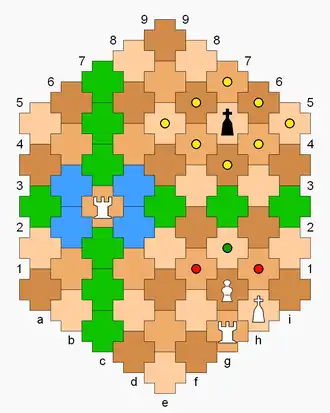The diagram shows the starting setup. Special rank and diagonal paths determine how pieces move, as described below. Check, checkmate, and stalemate are as in standard chess. However a pawn has no initial two-step option, and a rook can make a one-step diagonal move.[a]