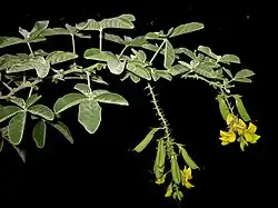 It is a shrub that grows around 2 meters high. It has compound leaves that are digitate with 5-7 leaflets and alternate. The tomentosa is silky-white that on drying turns brown. Its flowers are bi-sexual and flowering season is between October and December. It was found growing on crevices on rock surfaces and boulders. It can be separated by similar looking Crotalaria grahamiana by lack of hairs on the undersurface and linear obovate leaves and from Crotalaria quinquefolia that has more linear looking leaves with differentiating apex.[2][3]