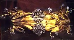 The crown, which weighs about 554 grams, consists of a central belt that is 23 millimeters wide and one millimeter thick. One half of the crown is adorned with 24 gold laurel leaves and, the other, with 13 gold palm leaves representing both a laurel wreath and the Martyrs Palm. The crown is decorated with 20 gold coiled threads, seven silver florets, five diamonds, and around 200 diamond sparkles.[3][7]
