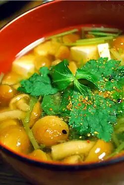 In Japan, it is commonly used as a garnish in soups or atop entrees or as a sushi ingredient. The white stems are blanched while they're tender, and have a taste similar to coriander.[12] Two main regional varieties exist, the green Kansai type, and the white Kantō type.[12]