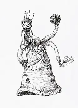 The "Mi-Go" are large, pinkish, fungoid, crustacean-like entities the size of a man; where a head would be, they have a "convoluted ellipsoid" composed of pyramided, fleshy rings and covered in antennae. They are about five feet (1.5 m) long, and their crustacean-like bodies bear numerous sets of paired appendages. They possess a pair of membranous bat-like wings which are used to fly through the "aether" of outer space.[18] The wings do not function well on Earth. Several other races in Lovecraft's Mythos also have wings like these.