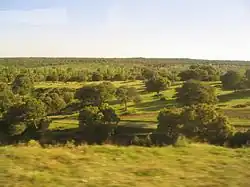 To the south of this mountain range, the terrain descends to the Monte de El Pardo, the third geomorphological unit through which the park runs, covering approximately 16 000 hectares.[8] The granitic materials give way to detrital and sandy elements, the result of the erosion of the Guadarrama and Hoyo mountain ranges, which form an undulating landscape of gentle hills, with an average altitude of 600 m. The Monte de El Pardo sits on an immature soil, easily eroded. Similar characteristics are found in Monte de Viñuelas, eastern appendix of El Pardo.