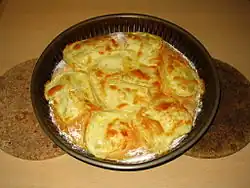 Some recipes by Hotin, cook to the "seigneur de Roubaix",[12] appear in a version of Le Ménagier de Paris. Both sweet and savory tarts feature prominently; in the 16th century, flamiches were cheese tarts made with bread dough, while goyère was a sweet white cheese tart.[9]