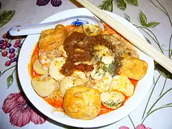 - Yong Tau Foo (酿豆腐; niàng dòu fǔ), a dish that contains a varied selection of food items, including tofu filled with ground meat mixture or fish paste, fish balls, crab sticks, an assortment of vegetables and meat.