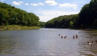 Cuivre River State Park is a public recreation area covering more than 6,400 acres (2,600 ha) northeast of the city of Troy in the Lincoln Hills region of northeastern Missouri, United States. The state park's rugged landscapes range from native grasslands and savannas to limestone bluffs overlooking forested hills. The park offers an extensive system of hiking trails plus swimming and camping facilities and is managed by the Missouri Department of Natural Resources.[5] It encompasses the Lincoln Hills Natural Area (1872 acres)[6] and two designated wild areas: Big Sugar Creek (1675 acres) and Northwoods (1082 acres).[7][8]