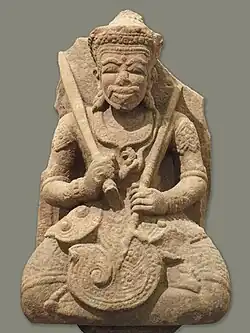 Vaishnavism entered Champa from Funan or Chenla, where characteristic depictions of crowned Vishnu date back to the 5th century. It likely arrived, like other Indian religions, through traders and sailors frequenting Cham ports. Most references to the Vaishnavite cult in Cham inscriptions date to the mid-7th century and are associated with King Vikrantavarman I.[87]