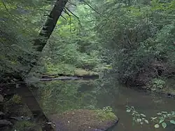 Byrd Creek, the park's major drainage, flows eastward from the hills to the west for approximately 5 miles (8.0 km) before veering north at its confluence with Coon Hollow Branch. The Byrd Creek Dam, which is located immediately north of this confluence, retains a reservoir that covers approximately 50 acres (0.20 km2). Beyond the dam, Byrd Creek absorbs Threemile Creek, which flows from the west, and continues eastward for another 10 miles (16 km) before emptying into Daddys Creek (a tributary of the Obed River) near Crab Orchard. Cumberland Mountain State Park forms a semicircle around Byrd Creek and Threemile Creek, with Byrd Lake being the eastern or "closed" half of the circle.