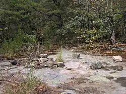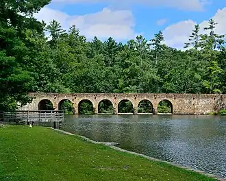 Part of the Cumberland Homesteads Project called for the construction of a recreational area near the center of the homesteads. Two New Deal agencies, the Works Progress Administration and the Civilian Conservation Corps, arrived in the area in 1934 to build the recreational area's facilities.[2] Company 3464 of the CCC, under the direction of the National Park Service, began the construction of Byrd Creek Dam in 1935 and completed it in 1938, effectively creating the 50-acre (0.20 km2) Byrd Lake. The dam, like many of the Homestead structures, is constructed of a native sandstone commonly called Crab Orchard Stone. At a height of 28 feet (8.5 m) and length of 319 feet (97 m), the dam is the largest masonry project ever completed by the CCC. CCC Company 3464, assisted by Company 1471, continued to work at the park until 1941, building trails, picnic areas, cabins, a boathouse, a bathhouse, and other structures.[3][4]