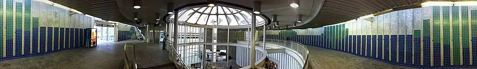 The Cumberland station was designed by Wojciech M. Madeyski of the architectural firm Perkins and Will.[18] Cumberland's island platform is located in the median of the Kennedy Expressway to the west of Cumberland Avenue. It serves the Blue Line's two tracks; the northern track serves trains to O'Hare, while the southern track serves trains to Forest Park. Electronic signs on the platform offer real-time information about train arrivals and service alerts; Cumberland is one of four 'L' stations with these signs, which were installed in 2002 as part of a pilot program.[19] A pedestrian overpass connects the platform to entrances on the north and south sides of the expressway.[15] The north side of the overpass leads to an exit stairway, while the south side leads to the main station building. The station building houses a public art sculpture, Rock Bow by Charles Ross; the sculpture consists of a 40 feet (12 m) high metal-cased prism set in a limestone base.[20] Cumberland's bus terminal and park and ride lot are also located south of the platform.[15] The park and ride lot has 1633 spaces and is operated by CPS Parking; the lot originally had 706 spaces and expanded to its current capacity in 1992.[21][22] The facilities at Cumberland are handicapped accessible.[23]