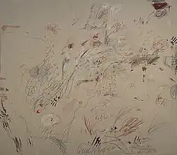 After his return in 1953, Twombly served in the United States Army as a cryptologist, an activity that left a distinct mark on his artistic style.[19] From 1955 to 1959, he worked in New York, where he became a prominent figure among a group of artists including Robert Rauschenberg, with whom he was sharing a studio,[20] and Jasper Johns. Exposure to the emerging New York School purged figurative aspects from his work, encouraging a simplified form of abstraction. He became fascinated with tribal art, using the painterly language of the early 1950s to invoke primitivism, reversing the normal evolution of the New York School. Twombly soon developed a technique of gestural drawing characterized by thin white lines on a dark canvas that appear to be scratched onto the surface. He would apply bitumen on the canvas in a quick and coarse fashion, making the painting tactile and scarred with his energetic, gestural lines that would become his signature style.[21][22] He stopped making sculptures in 1959 and did not take up sculpting again until 1976.[23]