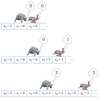 The algorithm thus maintains two pointers into the given sequence, one (the tortoise) at xi, and the other (the hare) at x2i. At each step of the algorithm, it increases i by one, moving the tortoise one step forward and the hare two steps forward in the sequence, and then compares the sequence values at these two pointers. The smallest value of i > 0 for which the tortoise and hare point to equal values is the desired value ν.