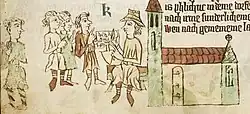 The origins of the halfshaven head are not clear. It was probably worn before the 12th century until its slow disappearance in the 18th century. Some of the earliest mentions of the "Polish halfshaven head" from the Middle Ages were written by an anonymous Franciscan in 1308,[1] Wincenty from Kielcza[2] (half of 13th century), and Austrian poet Zygfryd Helbling (end of 13th century),[3][4] who was swearing on Polish and Czech influences. In the chronicles of Mierzwa (beginning of 14th century) from Kraków, we can also read that Prince Leszek the Black (died in 1288) grew his hair to ingratiate himself with Germans, so it was a scandal both in his times and in the times of the chronicle. Graphic sources include the paten (half of 13th century) from Płock Cathedral commissioned by Konrad Mazowiecki, and the paten commissioned by Mieszko the Old (year 1195)[5] for the Cistercian monastery in Ląd, and the floor from Wiślica (years 1175-1180).[6]