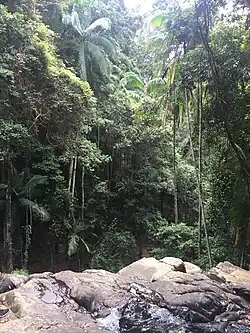 Moist sub-tropical rainforest grows on the highest parts of the range where the rainfall is two-thirds greater than in the foothills, particularly on the rich basaltic soils north of Mt Glorious. Huge strangler figs (Ficus watkinsiana) can be seen emerging through the canopy.[4]