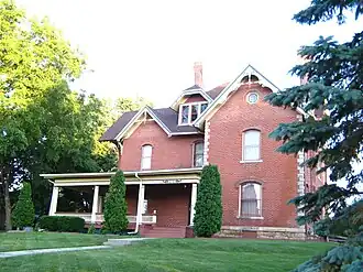 This is one of several houses in town that are noteworthy for their quoined corners, a rare architectural feature in Iowa.[2] The 2½-story brick house features an irregular roofline with both hipped and gabled areas, two large chimneys with corbelled chimney pots, and a wrap-around porch. It was built for D. H. Anderson in 1888 in a section of the city known as "Society Hill." These were financial boom years for Maquoketa. Anderson settled here with his parents in 1854, and grew to become a successful businessman. He married Mary L. Goodenow, the daughter of John L. Goodenow, who was known as the "Father of Maquoketa."