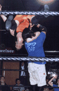 Also known as a springboard backflip three-quarter facelock inverted DDT. A wrestler puts the opponent into a ¾ facelock, then runs up the corner turnbuckles or ring ropes and jump backwards performing a backflip, and landing face down driving the opponent down to the mat back-first. Sometimes a standing variant is performed by wrestlers with adequate leaping ability or when assisted by a tag team partner. The move is popularly known, especially in North America, as Sliced Bread No. 2, a name created by wrestler Brian Kendrick.[6][7] In a slight variation named the sitout shiranui the wrestler lands into a seated position instead, driving the opponent's head between the legs. Seth Rollins used the Sliced Bread No. 2 early in NXT in 2011/2012 season.
