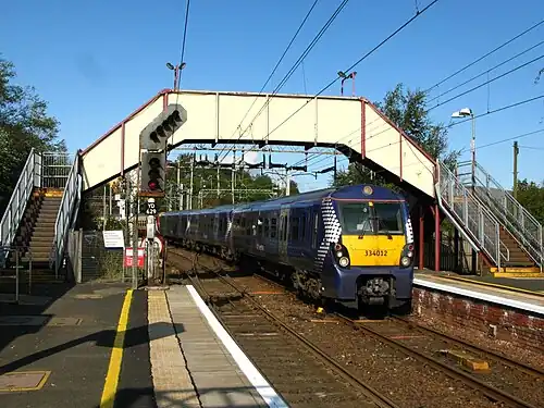 Dalreoch railway station serves the west end of Dumbarton in West Dunbartonshire, Scotland. The station is managed and served by ScotRail and is served by trains on the North Clyde Line. The station is 16 miles 38 chains (26.5 km) northwest of Glasgow Queen Street (High Level), measured via Singer and Maryhill.[3]