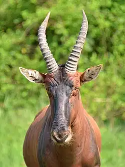 Topi resemble hartebeest but have a darker colouration and lack sharply angled horns. They have elongated heads, and a distinct hump at the base of the neck. Their horns are ringed and lyrate-shaped.[21] Their coats are made of short, shiny hairs.[22] They range in mass from 68 to 160 kg (150 to 353 lb). Head-and-body length can range from 150 to 210 cm (59 to 83 in) and the tail measures 40–60 cm (16–24 in). They are a tall species, ranging in height from 100 to 130 cm (39 to 51 in) at the shoulder.[23][24] Males tend to be larger and darker than females. Topi also have preorbital glands that secrete clear oil and the front legs have hoof glands.[21]