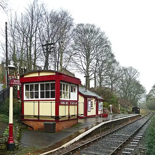 It claims to be Britain's smallest standard-gauge railway station,[2] although it is no longer part of the main rail network. Damems has the distinction of being a station rather than a halt because in its original form it included a stationmaster's house and a siding to serve the mill in the village. The stationmaster's house remains, and is owned by the heritage railway, although the siding has been removed. The level crossing at the station is controlled from a gate box originally from Earby on the Colne-Skipton line. The box was installed since preservation. The crossing was originally worked from a groundframe in the stationmaster's garden. The last crossing keeper at Damems was Annie Feather who lived in the stationmaster's house and received her wages which were thrown to her from the footplate of a passing locomotive.