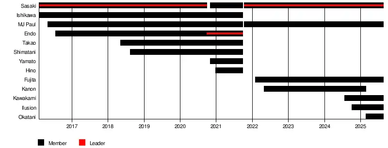 Various members of the unit are known to have made sporadic appearances in other promotions. On June 13, 2017, Ishikawa and Endo teamed up to defeat Nextream (Kento Miyahara and Yuma Aoyagi) on the second night of the Dynamite Series 2017, an event promoted by All Japan Pro Wrestling (AJPW).[38] At Machida Pro-Wrestling Festival Vol. 1, a freelance show promoted by the Japanese independent scene on September 8, 2017, Sasaki and Endo represented the unit as the defeated the team of Speed Of Sounds (Hercules Senga and Tsutomu Oosugi) in a tag team match, as well as Ishikawa teaming up with Masashi Takeda to pick up a victory over Big Japan Pro Wrestling's Daisuke Sekimoto and Yuko Miyamoto.[39] At Great Voyage in Yokohama Vol. 2, an event promoted by Pro Wrestling Noah on December 16, 2018, Nobuhiro Shimatani, who represented the stable, teamed up with Kazusada Higuchi and Kota Umeda in a losing effort to Atsushi Kotoge, Kenoh and Masa Kitamiya.[40] On May 4, 2019, at Mercury Rising, an event promoted by WWNLive, Sasaki, Takao and Endo defeated The Skulk (Adrian Alanis, A. R. Fox and Leon Ruff).[41] At Infinity: 2021 Spring, an event promoted by Active Advance Pro Wrestling (2AW) on February 7, Ishikawa represented the stable as he teamed up with Ryuki Honda in a losing effort to Kengo Mashimo and Tatsuya Hanami.[42]