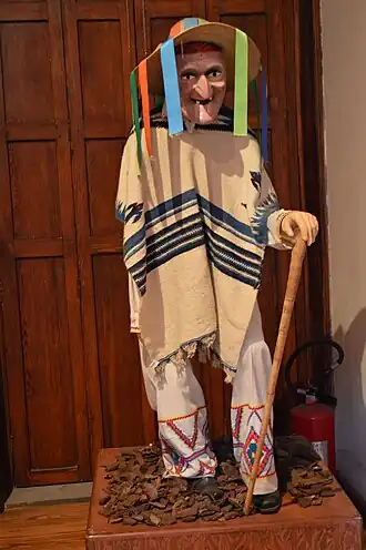 A Danzante wears a top and bottom made out of a white blanket. It is topped with a "sarape," which is a blanket worn as a cloak in Latin America. Each sarape contains different designs and colors. They wear a hat made out of straw with adorned lengthy pieces of ribbon, each one a different color. The ribbon is parted down the middle of the hat, each one hanging 10 cm on the sides. Their shoes are sandals that have a wooden sole in order to make a tapping noise throughout their dance, followed by a wooden cane they also use. The dancers also wear a mask made out of either wood, cornstalk paste, or clay with an elderly man's face painted on it.