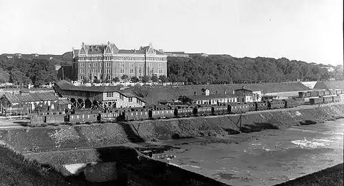 The first railway arrived in Danzig (as Gdańsk was them known) in 1852, with the creation of the Danzig Leeges Tor station, connecting Danzig with Dirschau.[1] In 1865, construction work began on a new railway line from the south of the city to Neufahrwasser. Along this line, the new Danzig Hohetor Bahnhof was built, with the first train arriving on 1 October 1867. Its name came from the nearby Brama Wyżynna.[2][3]