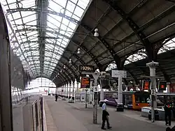 Darlington was a major part of the scheme and so had some of the largest proposed improvements. To reduce the need for local services to cross the East Coast Main Line, two new eastern platforms would have been created.[14] The new platforms would be connected to the main building by a new footbridge and lifts, and the existing car parking places that would have been lost with the new platforms would be replaced at a similar distance from the station. A new entrance, including pick-up/drop-off facilities, was considered on the eastern side.[10] Furthermore, release of track capacity on the ECML to allow more trains to run from Darlington to York and Newcastle and improved service to Saltburn (1–2 to 4 trains per hour) and new rolling stock were proposed.[10] While unclear and never having concrete plans, street-running trams to Darlington town centre were also proposed in a future phase of the Metro.[13]