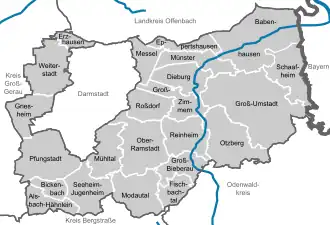 Darmstadt-Dieburg is a Kreis (district) in the south of Hesse, Germany. Neighboring districts are Offenbach, Aschaffenburg, Miltenberg, Odenwaldkreis, Bergstraße, Groß-Gerau, and the district-free city of Darmstadt, which it surrounds.