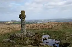 Located on Ugborough Moor, three miles north-east of Ivybridge, this cross is at the crossroads of an ancient east–west track between Exeter and Plymouth, and the north-south Blackwood path that was once used by peat cutters.[26]