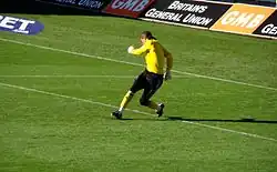 James made his debut for West Ham on 24 November 2001 in a 1–0 home loss to Tottenham Hotspur.[22] In 2002–03, West Ham were relegated to the First Division. James stayed with West Ham at the start of the 2003–04 season before returning to the Premier League, signing for Manchester City on 14 January 2004 for an undisclosed fee as a replacement for the retired David Seaman.[23][24] He played 102 total games in all competitions for West Ham.[25]