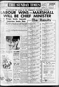 - ^ "Labour Wins – Marshall Will Be Chief Minister". The Straits Times. 3 April 1955. p. 1. Retrieved 21 June 2025 – via NewspaperSG.