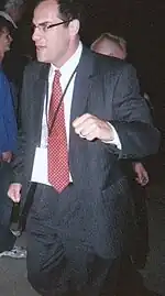 David Wallace is a fictional character in the American comedy series The Office, portrayed by Andy Buckley. Wallace is introduced in the second season as the new chief financial officer of Dunder Mifflin. Wallace is named after David Foster Wallace, a favorite author of John Krasinski and executive producer Michael Schur.[1] The other characters almost exclusively refer to him by the full name "David Wallace", rather than by simply his first name. His character is established as a wealthy executive at the corporate headquarters in New York with an opulent suburban home, a wife, Rachel, and two kids – one son and one daughter. Despite his differing lifestyle from the members of the Scranton branch, David tolerates and understands the eccentricities and flaws of Regional Manager Michael Scott, and appreciates employees Jim Halpert and Toby Flenderson. He is let go in the sixth season following the absorption of Dunder Mifflin by Sabre. He later sells his patent for a toy vacuum, called "Suck It,"[2] to the U.S. military for $20 million[2] and subsequently acquires Dunder Mifflin for an undisclosed sum of money, becoming CEO in the eighth-season finale, "Free Family Portrait Studio".