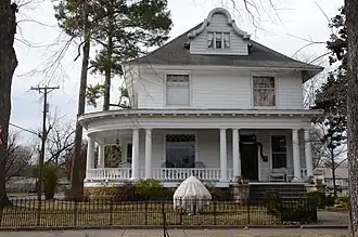 The Davis House is a historic house at 212 Fulton Street in Clarksville, Arkansas. It is a 2+1⁄2-story wood-frame American Foursquare structure, with a hip roof, weatherboard siding, and a foundation of rusticated concrete blocks. The roof has flared eaves with exposed rafter ends, and a front-facing dormer with a Flemish-style gable. The porch extends across the front and curves around to the side, supported by Tuscan columns. The house was built about 1905 to a design by noted Arkansas architect Charles L. Thompson.[2]