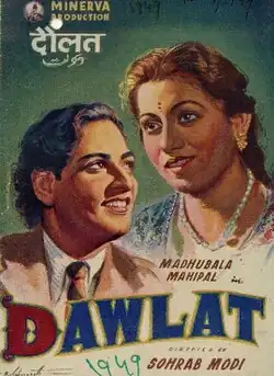 Dawlat (transl. "Money") is a 1949 Indian comedy film[1] directed by Sohrab Modi, produced by Minerva Movietone and starring Madhubala and Mahipal in lead roles.[2] The music for the film was composed by Hanuman Prasad. It revolves around a young man trying to impress a rich father in order to marry his beautiful daughter.[3]