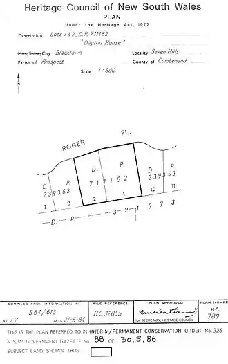 - ^ a b c d e f g h i j k l m n o p q r s t u v w x y z aa ab ac ad ae af ag ah ai aj ak al am an ao ap aq ar as at au av "Dayton House". New South Wales State Heritage Register. Department of Planning & Environment. H00325. Retrieved 1 June 2018.