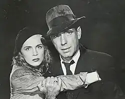 Dead Reckoning was originally intended by Columbia Pictures' production chief Harry Cohn as a vehicle for Rita Hayworth, a follow-up to the extremely popular Gilda.[3] Cohn thought that the pairing of Hayworth and Bogart would be a guaranteed money maker. However, Hayworth was in the middle of a contract dispute with Columbia, and refused to make the film, so she was replaced by Lizabeth Scott, who was borrowed from Paramount Pictures' producer Hal Wallis.[3][4] Scott, an up-and-coming actress being promoted as "The Threat", was often compared to Bogart's wife, Lauren Bacall, as both were former models, and had deep, sultry voices.[5][6] In an interview following the production's completion, Bogart commented on working with Scott: "I was warned that she was temperamental, but she couldn't have been nicer to work with."[7] He also refuted the press's comparisons of her to Bacall, instead stating that he felt she more resembled Mayo Methot, his previous wife."[7] When Scott first met Bogart, she gifted him a yachting cap as a nod to his enthusiasm for seafaring and service in the United States Navy.[8]