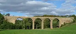 The Dean Bridge spans the Water of Leith in the city of Edinburgh on the A90 road to Queensferry on the Firth of Forth. It carries the roadway, 447 feet (136 m) long and 39 feet (12 m) broad, on four arches rising 106 feet (32 m) above the river.[1] The bridge was one of the last major works before retirement of the bridge designer, civil engineer Thomas Telford, and was completed in 1831 when he was seventy-three years old.[2]