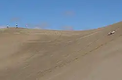 The hot, dry climate makes it difficult for soil to form. Mass wasting, the down-slope movement of loose rock, is therefore the dominant erosive force in mountainous areas, resulting in "skeletonized" ranges (mountains with very little soil on them). Sand dunes in the park, while famous, are not nearly as widespread as their fame or the dryness of the area may suggest. The Mesquite Flat dune field is the most easily accessible from the paved road just east of Stovepipe Wells in the north-central part of the valley and is primarily made of quartz sand. Another dune field is just 10 miles (16 km) to the north but is instead mostly composed of travertine sand.[24] The highest dunes in the park, and some of the highest in North America, are located in the Eureka Valley about 50 miles (80 km) to the north of Stovepipe Wells, while the Panamint Valley dunes and the Saline Valley dunes are located west and northwest of the town, respectively. The Ibex dune field is near the seldom-visited Ibex Hill in the southernmost part of the park, just south of the Saratoga Springs marshland. All the latter four dune fields are accessible only via unpaved roads. Prevailing winds in the winter come from the north, and prevailing winds in the summer come from the south. Thus, the overall position of the dune fields remains more or less fixed.