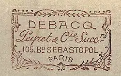 Debacq & Cie was established in Paris in 1812 by Raymond Sabe, who manufactured and traded gold jewellery on 358 rue de la Port St Denis.[3][4] In 1838, he handed the business to his nephews Félix, Victor and Pierre Eugène.[5] Together with Sinice Debacq (the husband of Sabe’s niece) they started a new company "Debacq et Sabe", also known as "Debacq et Sabe neveu" with a store at Royale St Martin 29.[5][6][7]