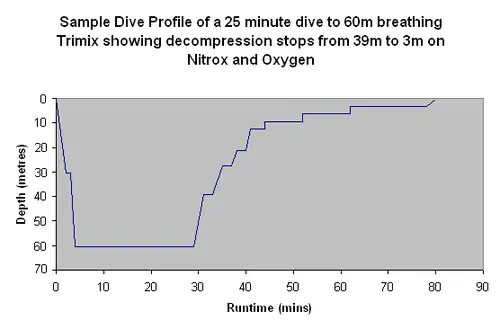 A decompression schedule is a specified ascent rate and series of increasingly shallower decompression stops—usually for increasing amounts of time—that a diver performs to outgas inert gases from their body during ascent to the surface to reduce the risk of decompression sickness. In a decompression dive, the decompression phase may make up a large part of the time spent underwater (in many cases it is longer than the actual time spent at depth).[22]