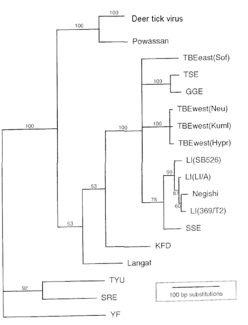 - ^ Kuno G, Artsob H, Karabatsos N, Tsuchiya KR, Chang GJ (November 2001). "Genomic sequencing of deer tick virus and phylogeny of powassan-related viruses of North America". Am. J. Trop. Med. Hyg. 65 (5): 671–6. doi:10.4269/ajtmh.2001.65.671. PMID 11716135.