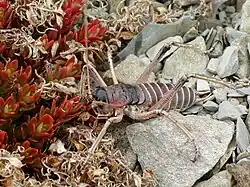 Deinacrida connectens is New Zealand's largest nocturnal alpine insect, but occurs at lower abundance than smaller grasshopper and cockroach species in the same environment.[13] The scree wētā is known to be capable of dispersing some fleshy fruit seeds by endozoochory.[12] In an experiment, D. connectens' ability to disperse seeds of Gaultheria depressa by feeding was found to be dependent on the size of the wētā.[12] At smaller sizes, fewer seeds were eaten and the wētā could be considered seed predators, (almost no seeds made it intact through the guts of individuals measuring 2 cm or less).[12] With larger sized wētā however, thousands of seeds were consumed, some of which were presumably capable of being dispersed large distances, suggesting D. connectens can act as a seed disperser.[12] One captive individual D. connectens was recorded successfully passing 686 intact seeds.[12]