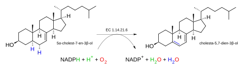 The substrates of this enzyme were listed as 5α-cholest-7-en-3β-ol, NAD(P)H, H+, and O2. Its products were listed as cholesta-5,7-dien-3β-ol (provitamin D3), NAD+ or NADP+, and H2O. It was stated that the enzyme has two cofactors: FAD, and FMN.