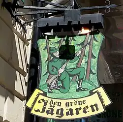 Today's restaurant is located on the ground floor of Hellgrenska Palace and was built in 1866. On the façade there is the classic flag sign with a green clad hunter with his gun.[2] The building previously housed the nobleman's apartments, where Oscar II also drank. For many years the restaurant Norma was located in the premises. The facade now features the classic flag sign showing a green-clad hunter with a gun. Den Gröne Jägaren underwent an extensive renovation in 2019.